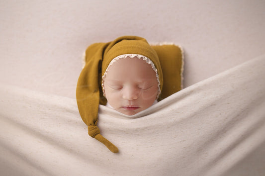 Baby Under Covers with Yellow Sleepy Hat and Pillow PNG Newborn Digital Backdrop