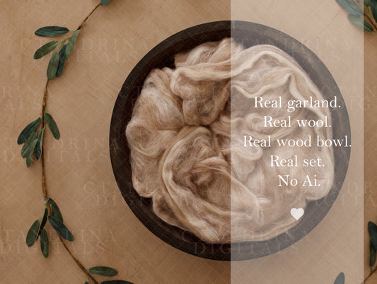 Green Leaf Wreath with Wooden Bowl Newborn Digital Backdrop