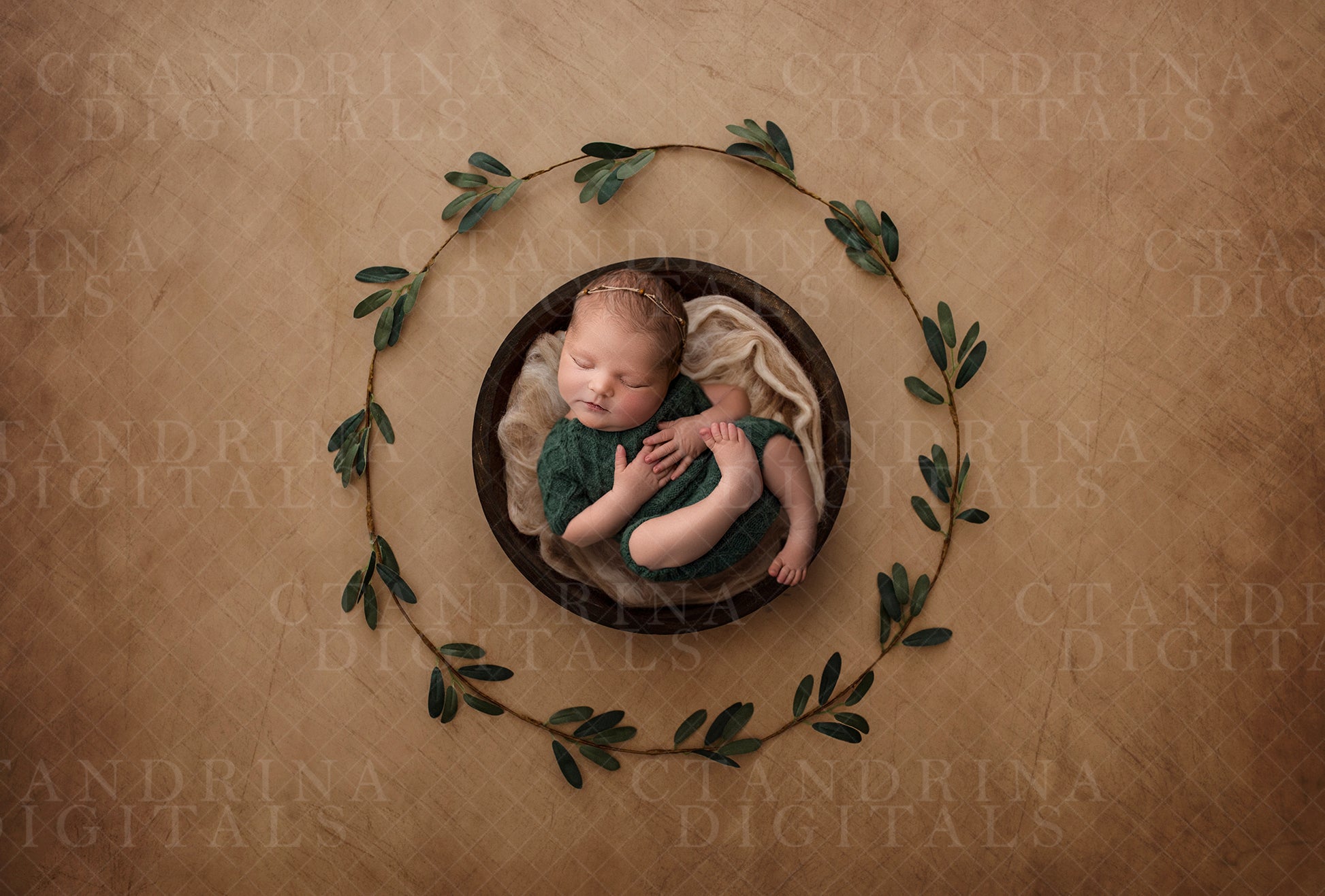Green Leaf Wreath with Wooden Bowl Newborn Digital Backdrop